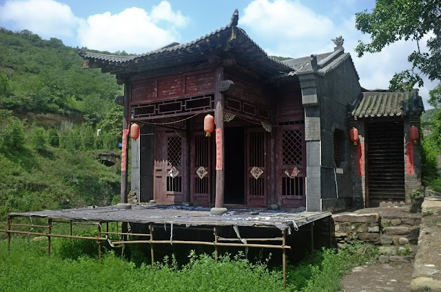 Then, he leaves the road and brings us to a deserted ancient village in a small river valley. The hillside is covered by a cascade of stone houses pressed against each other, and stairs. Except from round red Chinese lanterns suspended on roofs or wooden structures, the village looks completely abandoned. The only house that looks used is the one belonging to our driver. He shows us we can sleep somewhere in the village and tells us to come back in the morning. At least we think so. We don’t manage to ask him where exactly we can put up our tent, though, so we start exploring the village.